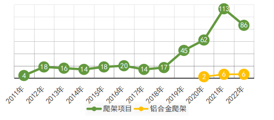 截止到2022年底,共有427項(xiàng)爬架項(xiàng)目通過(guò)了住建部科技與產(chǎn)業(yè)化發(fā)展中心評(píng)估,其中2022年86項(xiàng),包含6項(xiàng)鋼-鋁合金組合爬架,同比下降23%。